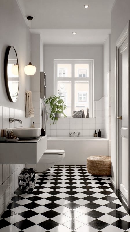 Black-checkered floor that lifts the entire bathroom – can’t imagine a nicer expression.