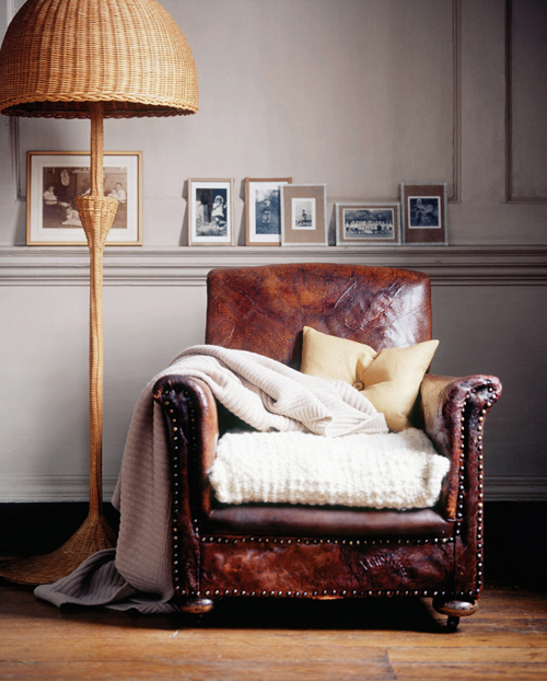 Old worn leather arm chair in living room
