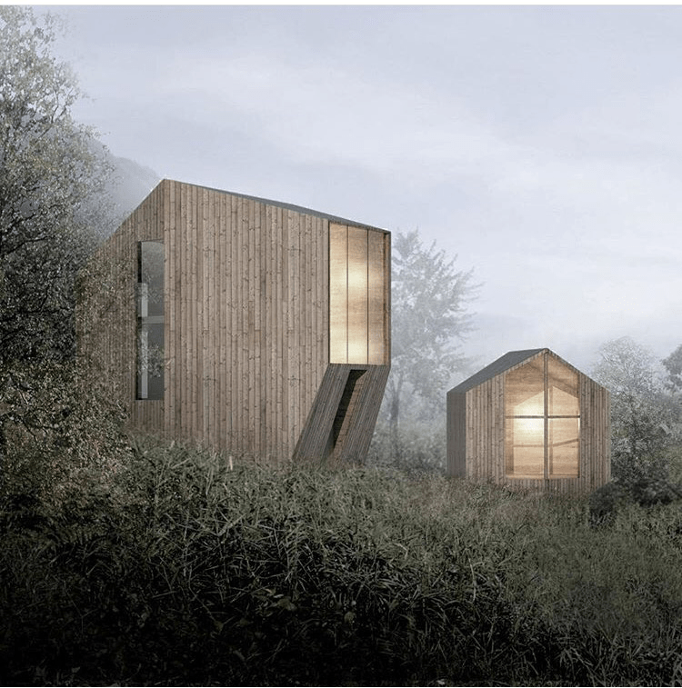 Holiday cabins in the Norwegian countryside – popping up in the nature with the fog all around like in a fairy tale. Angular wooden cabins with big windows & exciting architecture – simply beautiful!