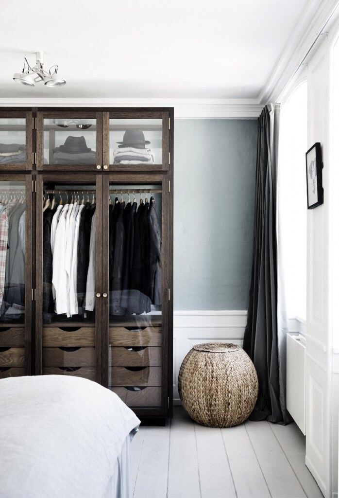 Danish furniture craftsmanship with flair, beautifully staged with dark wood to a wall colour that breaks off in a pleasant way. Nice props that reinforces the whole bedroom with a great feel.