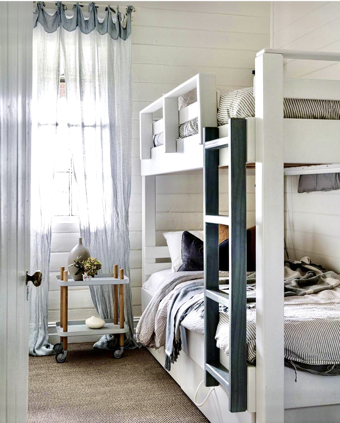 Kids room, with a lovely bunk bed dressed nicely with lots of textiles making it friendly & inviting .