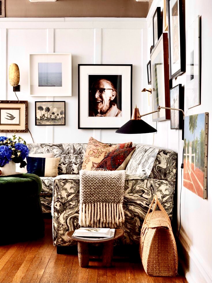 A lot of patterns & materials – and yet they work well together. It’s nice with personally chosen precious possessions sharing a common area with respect for each other.