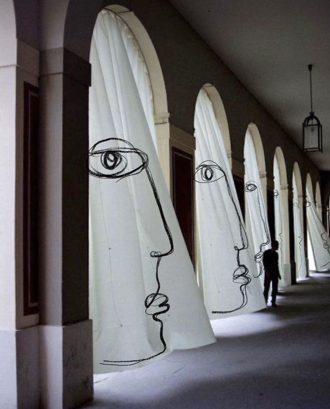 Linear similarity in a walkway – repetition of printed faces on textile fluttering in the wind, creates an exciting dimension.