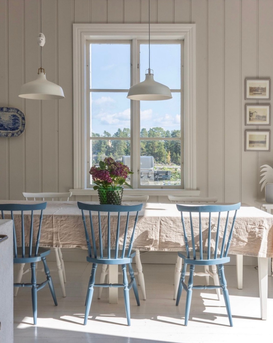 Nice to keep the whole in the same color scale, white & eggshell shade, let the daylight flow in by avoiding curtains – and add a fresh color, in this case, a lovely light blue color.