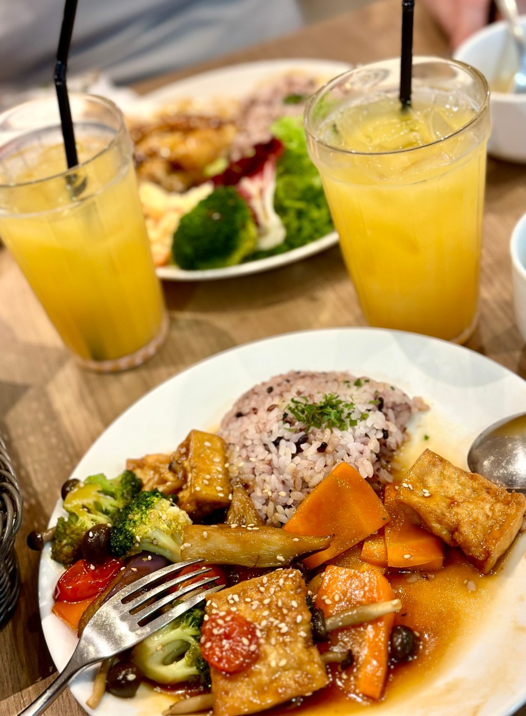 Tofu stir-fry with broccoli, mushrooms and aubergine – vegetarian meal at a Taiwanese place.