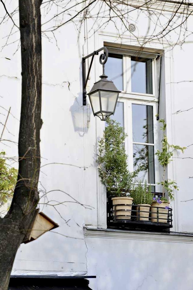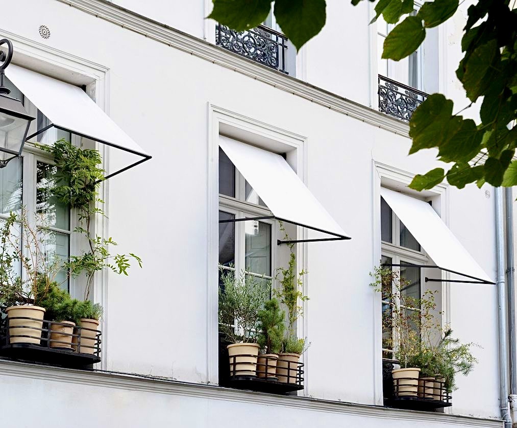 Nicely decorated windows – austere, and simple but still very charming. White house facade, white window, white awning & three pots with green plants. The wall lamp adds character.
