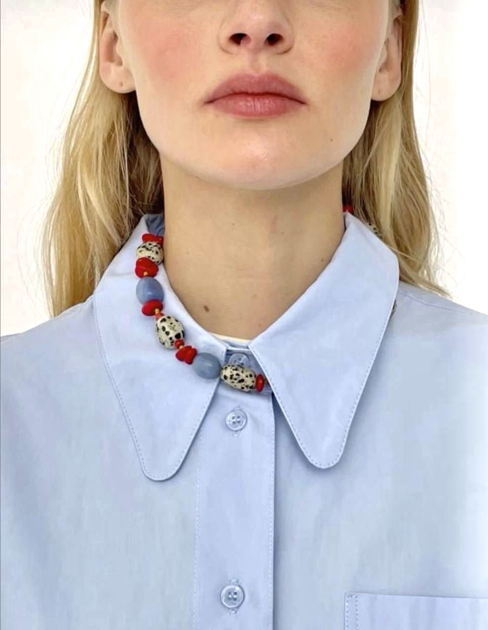 A stylish detail that feels a bit fun & casual – to leave your necklace half visible under your collar.