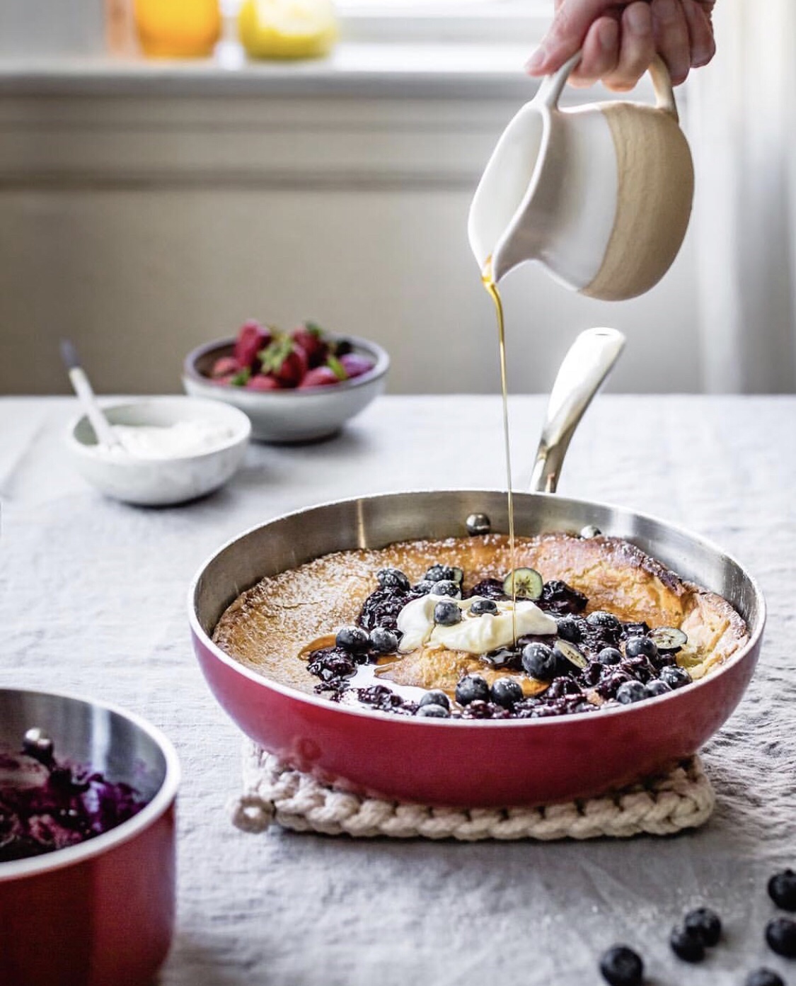 Gluten-free dutch baby made with sweet rice, oat, and millet flours, topped with dollops of blueberry chia jam, Greek yogurt, fresh berries – and a pour of maple syrup. A perfect steady breakfast gather around. Check out this account: linkinprofile.com/the_bojon_gourmet