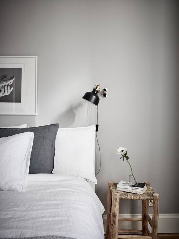 A kitchen with soft colors, especially nicely done with its light grey dining area. The mixture of furniture, the soft rug with the simple pattern & the grey wooden wall halfway up, gives a very sought-after result with simplicity that’s very apparent.