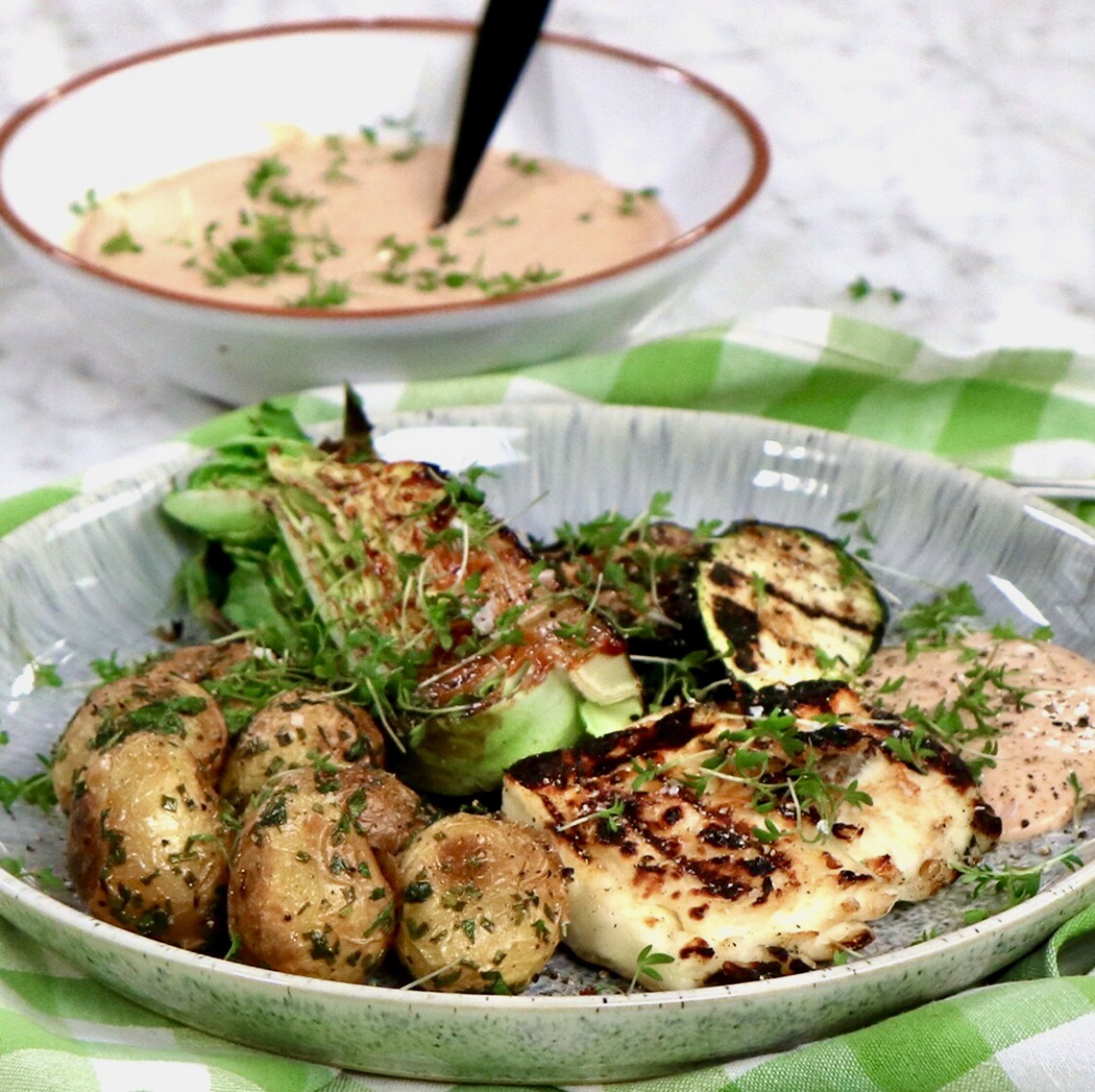 Barbecue plate with barbecue-grilled vegetables & roasted fresh new potatoes in a herbaceous vinaigrette.