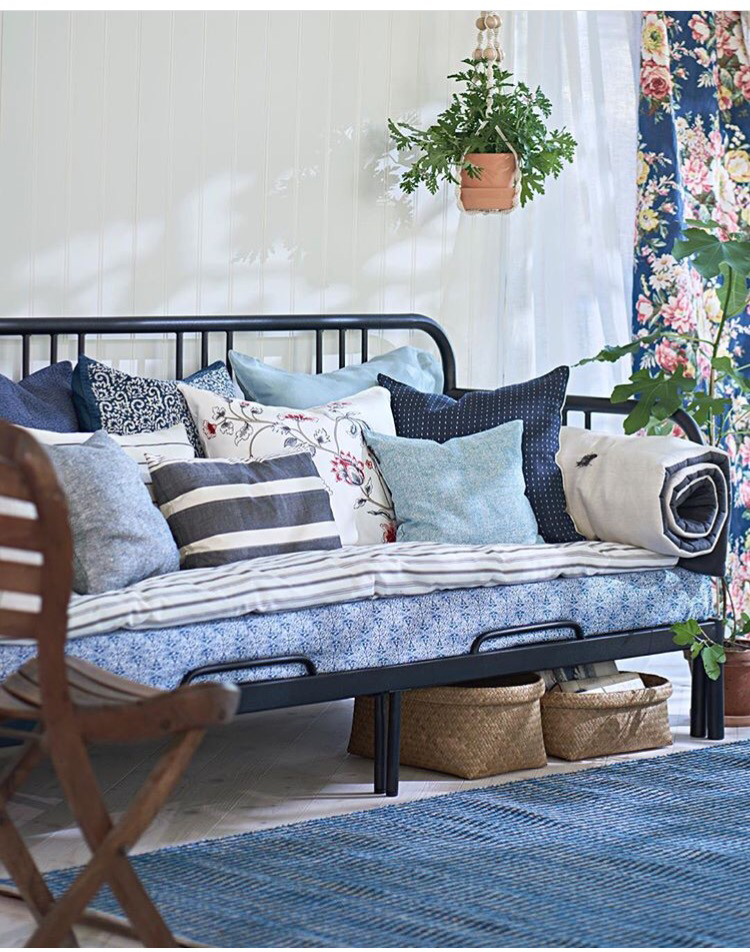 A robust iron sofa with a whole bunch of wonderful pillows in different colours and patterns. It is a lovely sight & feel for the eye & perfect for an outdoor room.
