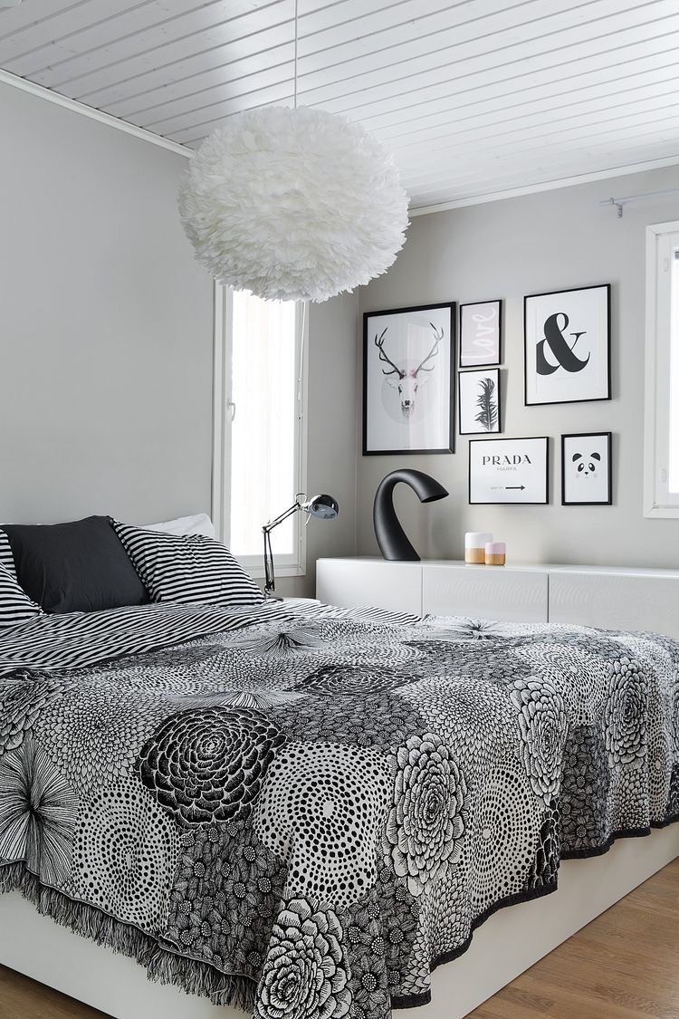 Bedroom in black white with graphic textiles mixed with stripes – beautiful in its simplicity.