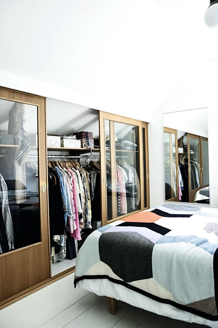 An integrated wardrobe in the bedroom under sloping walls with glass doors & wooden frame. A solution that gives the room depth & makes it feel larger. At the same time, the row of clothes hangers becomes a beautiful work of art in the bedroom.