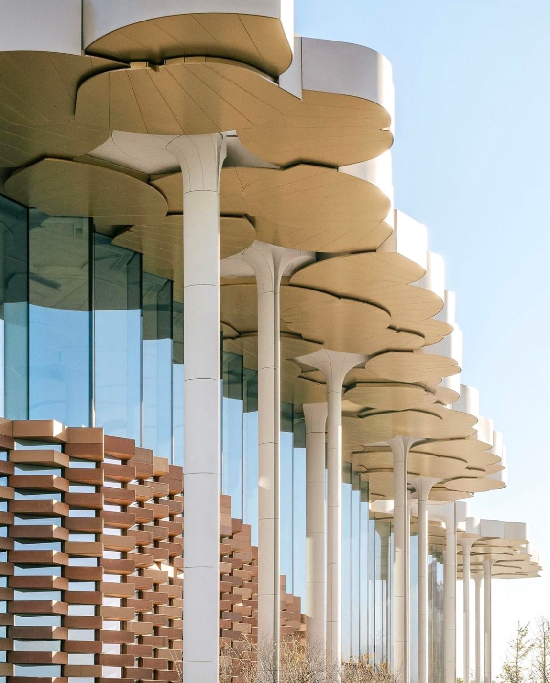 ‘valleys’. The glass-clad building, which serves as the world’s largest climatized reading space, invites nature into the rooms & adds transparency to the enriched interior when viewed from the outside. The architecture reminds of Frank Lloyd Wright.