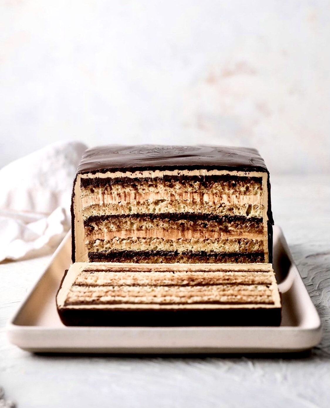 A stunning classic dessert – layered french opera cake, coffee soaked almond sponge, coffee flavoured buttercream, chocolate ganache topped with chocolate glaze.