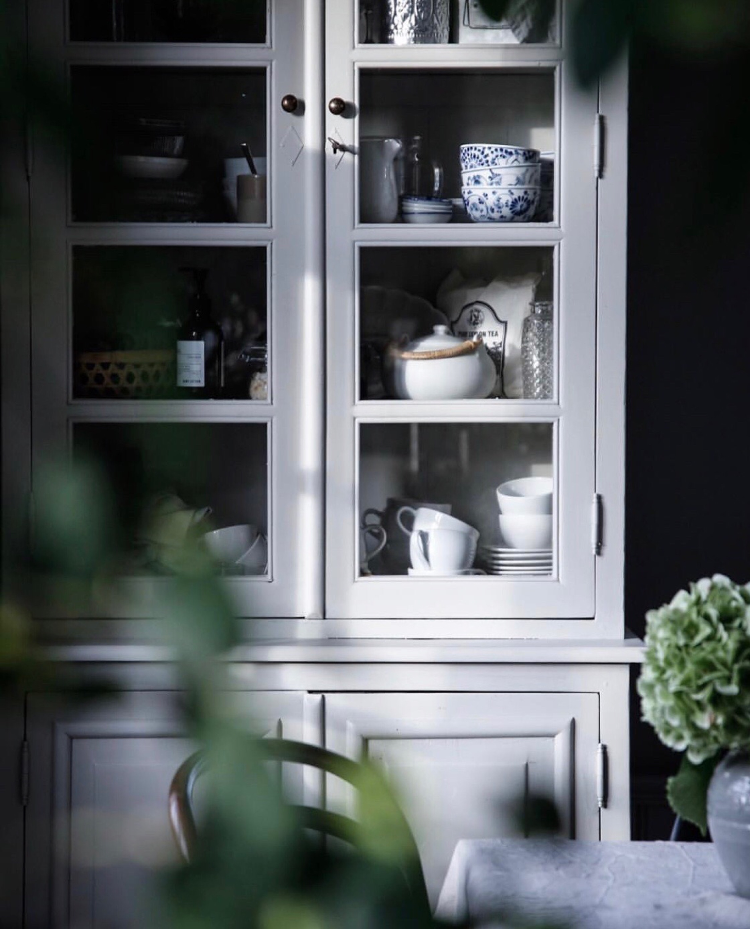 High kitchen cabinets, stand-alone with glass doors – has always been a favorite furniture. So easy to get the height, colour & an interesting aspect of the interior design with beautiful precious things you care about, want to keep safe from prying little fingers but still like to see – for beauty’s sake.