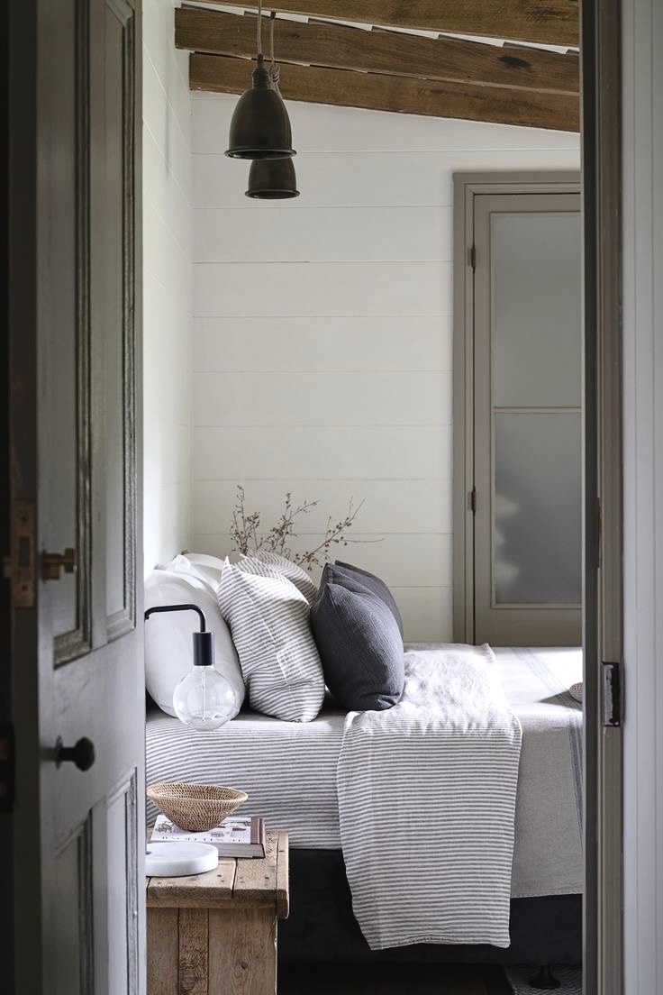 Country style bedroom adorned with original timber ceiling beams & luxurious linen. One of the easiest things you can add to a room for beautiful & comfortable living.