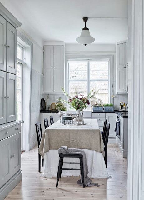 Nice kitchen with hardwood floors & nice carpentry details – but what makes it all is the table laid with linen cloth in a fine soft color – with black chairs as contrast.