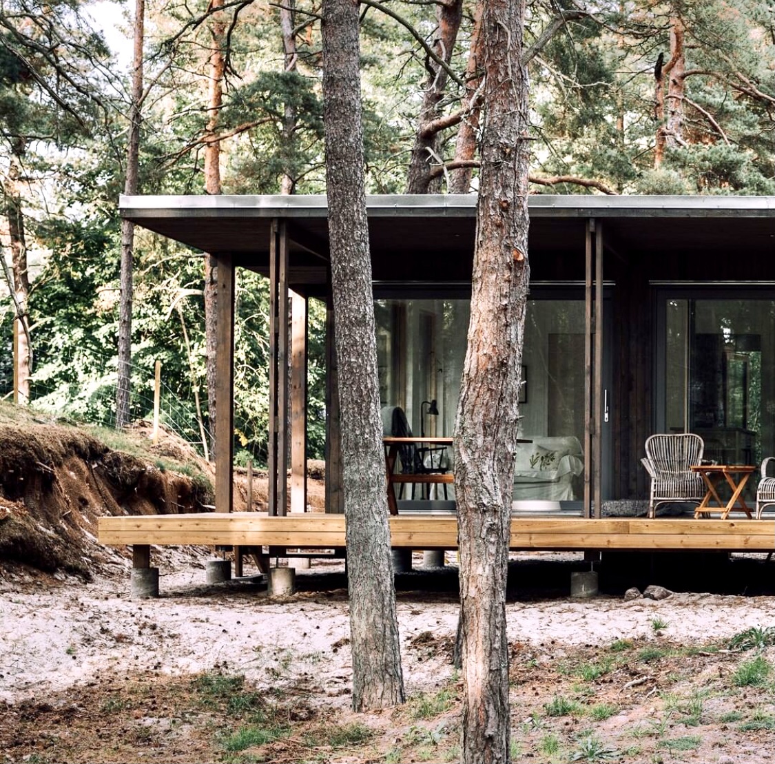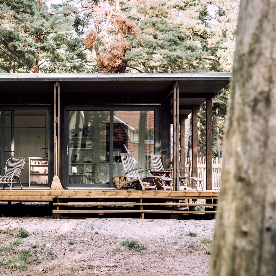A modern holiday home with a projecting roof for the outdoor area for mild summer evenings. In the middle of nature, the forest & everything you need for a simple life, within easy reach.