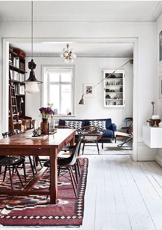 The dining area in focus here, with simple light furniture, rugs that both dampen sound & contribute to well-being. Damped color scale & many nice decor details.
