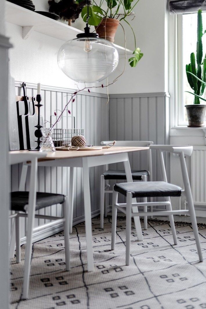 A kitchen with soft colors, especially nicely done with its light grey dining area. The mixture of furniture, the soft rug with the simple pattern & the grey wooden wall halfway up, gives a very sought-after result with simplicity that’s very apparent.