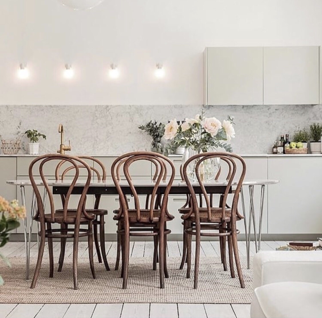 Classic cafe chairs in dark wood to a modern white dining table – always a great combination.