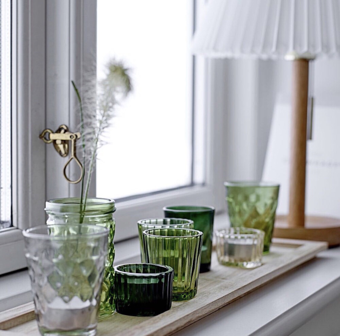 Such a sweet setup with the patterned wallpaper, bedside table, beddings & wall lamp in light green shades.