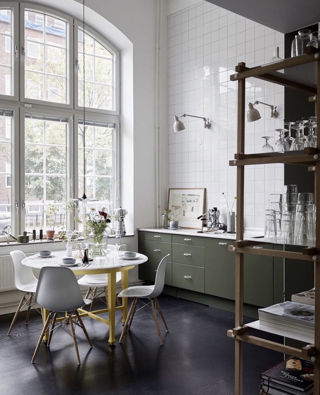 Amazing interior with beautiful windows but also the tiled wall together with the antique green kitchen – yellow dining table and dark flooring.