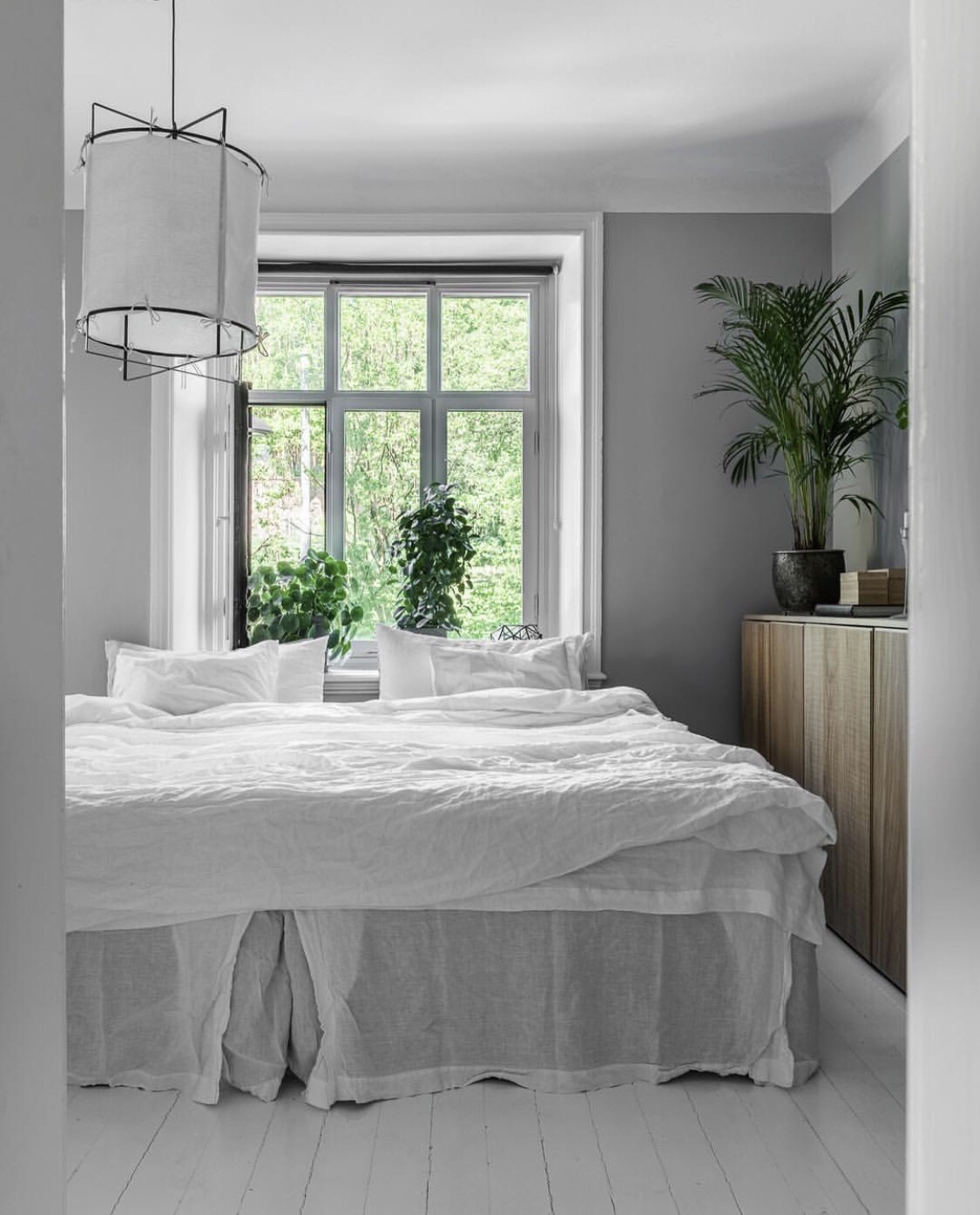 Beautiful bedroom that at first sight looks ordinary yet aesthetically appealing – no distractions – just a relaxing environment for a tired soul. An interior in a stripped room yet comfortable with white floors, white linen bed sheets & wooden storage. The greenery inside & outside provides a soothing effect.