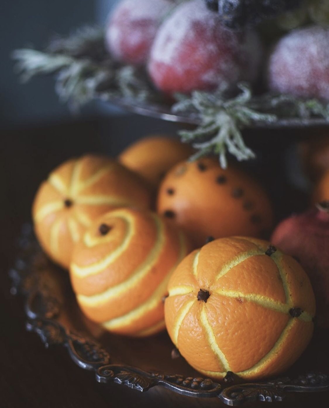 A fruit bowl with frosted fruit is incredibly beautiful, the effect is almost like an old painting. Beautifully decorated oranges, cut in patterns with carnations inserted, create a wonderful Christmas scent in the home.