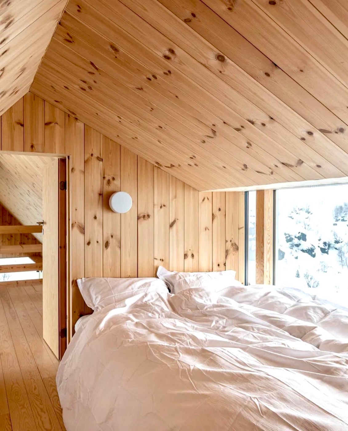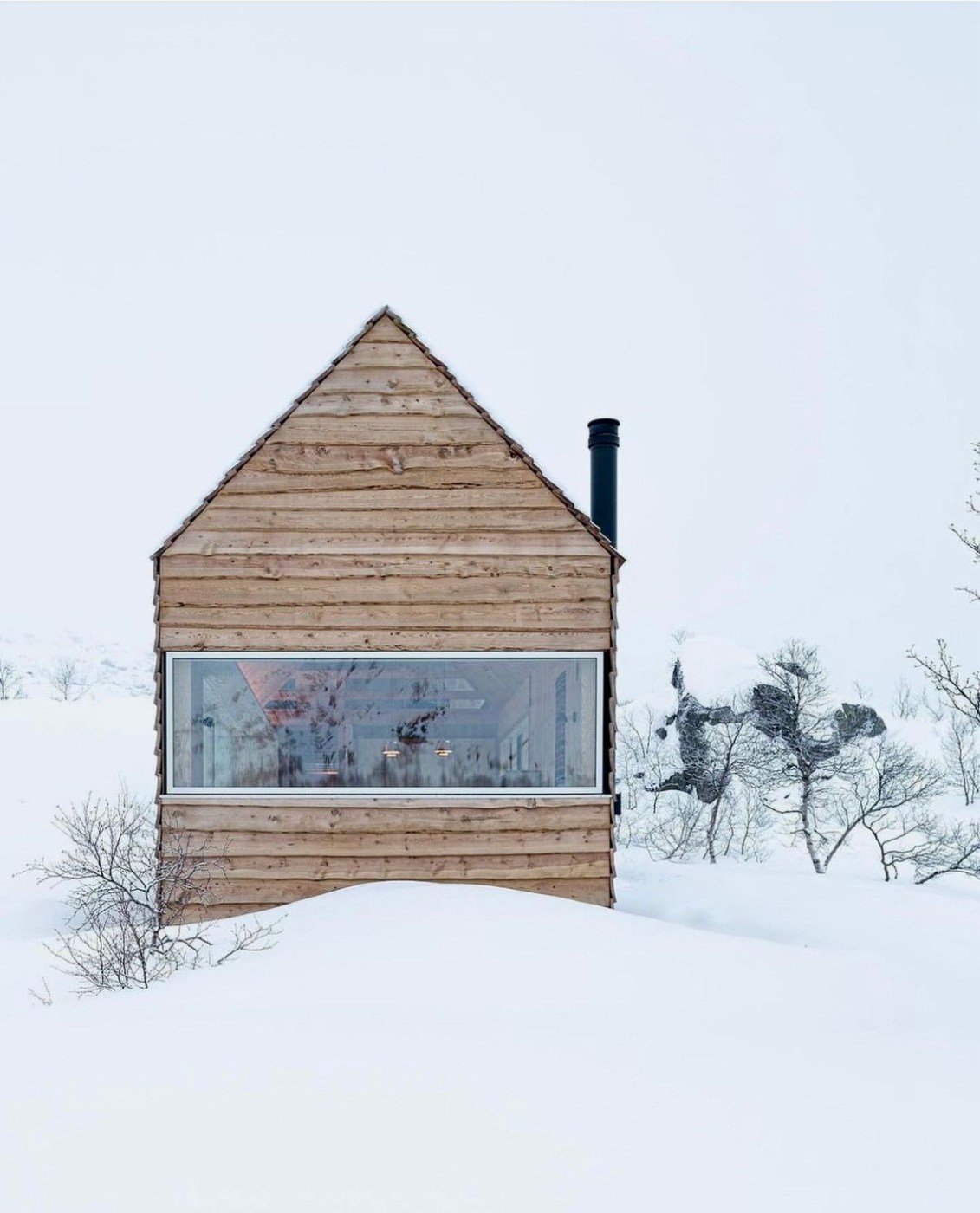 A tiny house in the middle of a snowy landscape. Tiny from the outside & well planned & spacious on the inside.