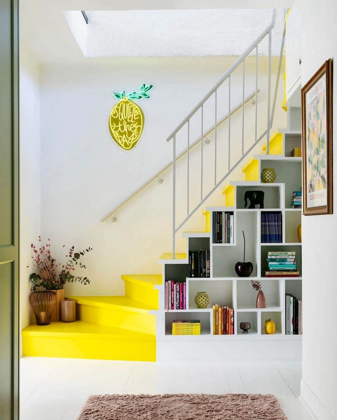 A smart idea to use, under the stairs that becomes a great storage solution & an inspiring eye catcher in the hallway. Either or without colour.