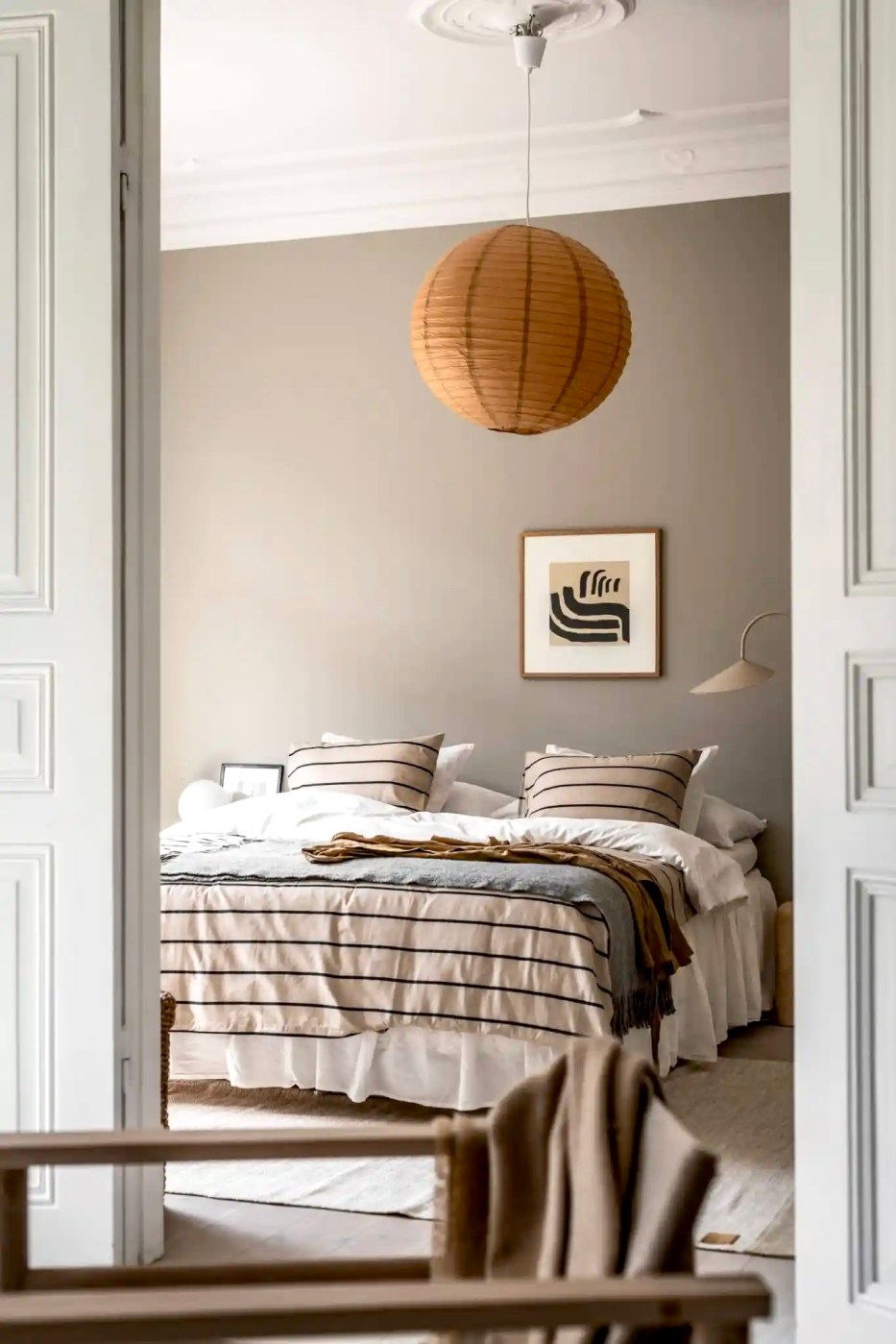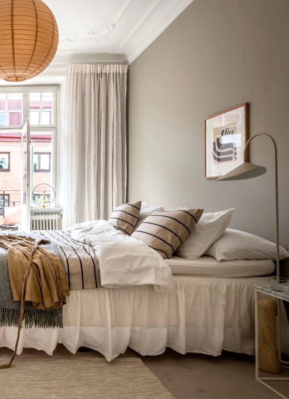 What a difference a small change can make. From plain bed linen to a striped bedspread & matching pillowcases. Colors that harmonize well with the rest of the room.
