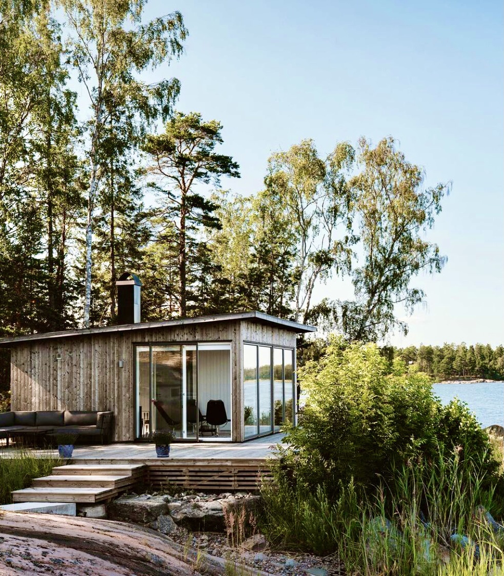 A wonderful cottage right by the water & with the forest behind – and a site-built sauna by the pier. With large windows that let in light & direct the gaze towards the horizon. Sounds like a dream.