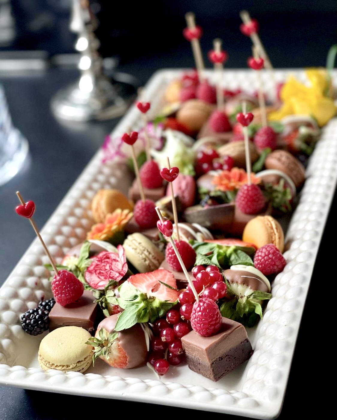 What a great delight when food can look so beautiful. Fruit, berries, chocolate & macaroons in a nice mix. Or whatever you’d like to use, of course.