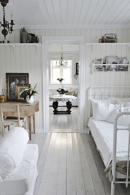 A nice white interior where floors & ceilings have been preserved & painted in white. Stylish with the white ribbed wall panel.
