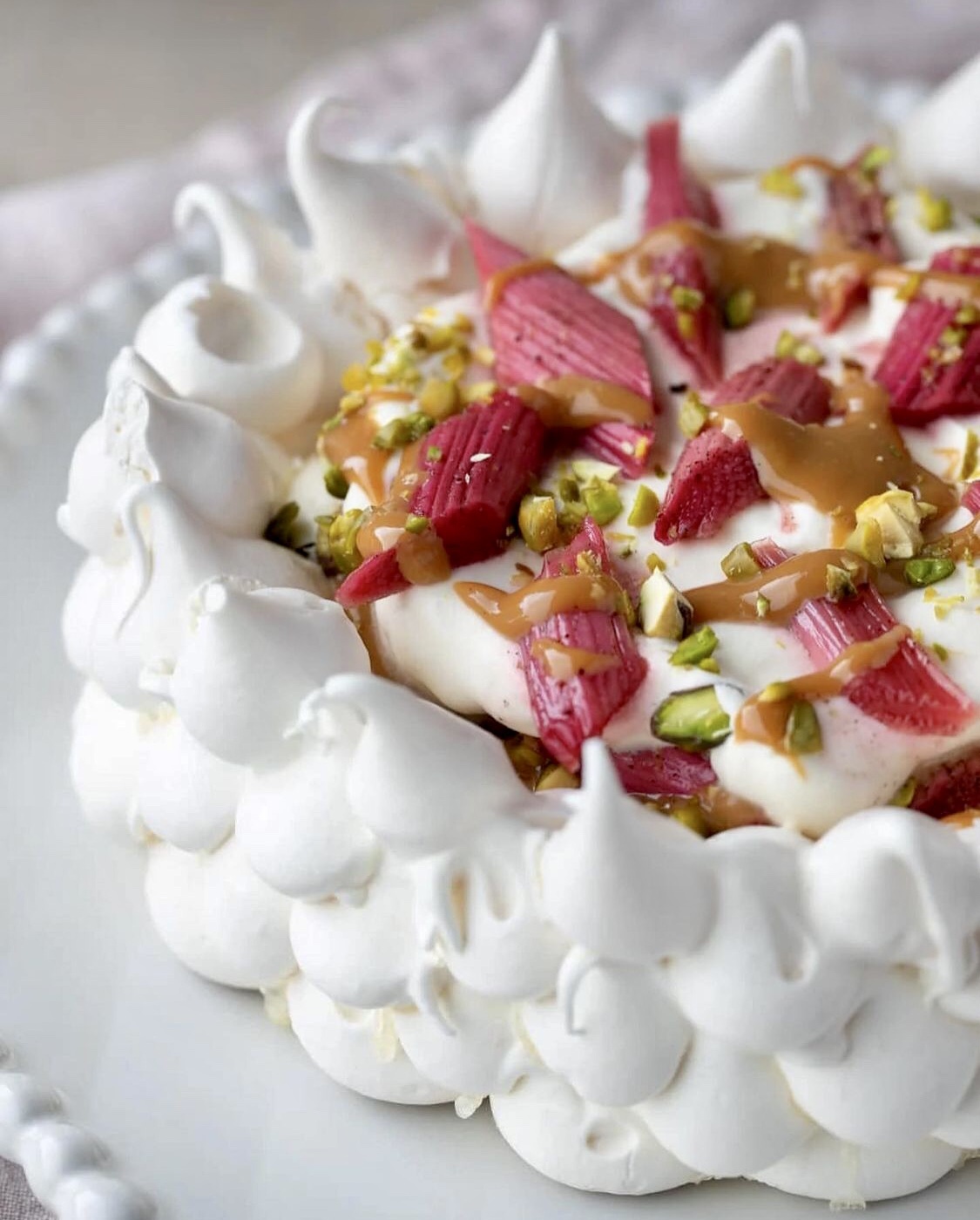 Beautifully decorated Pavlova with oven-baked rhubarb, caramel sauce & pistachios. Made on a meringue base & filled with whipped cream. Crispy & chewy at the same time.