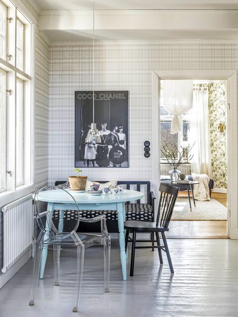 A cozy home with white painted floors, different wallpaper, and a nice mix of furniture that holds a balanced experience in a modern / rustic style. Bright & spacious with nice details.