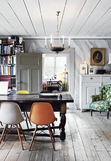 An image from a charming loft in Amsterdam – with a personal mix of furniture of old & new. The cornice in black for the lighting holds together the whole, which makes it easier when the ceiling lights & other décor also are in black. Black & white with the addition of worn leather armchair, old wooden box, blue table & oriental rug – it sure is nice, right?Â