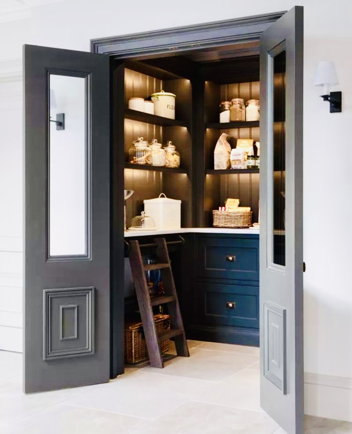 A dream pantry – with lots of open shelves, great addition with cabinets & drawers, good lighting & subdued color choice.