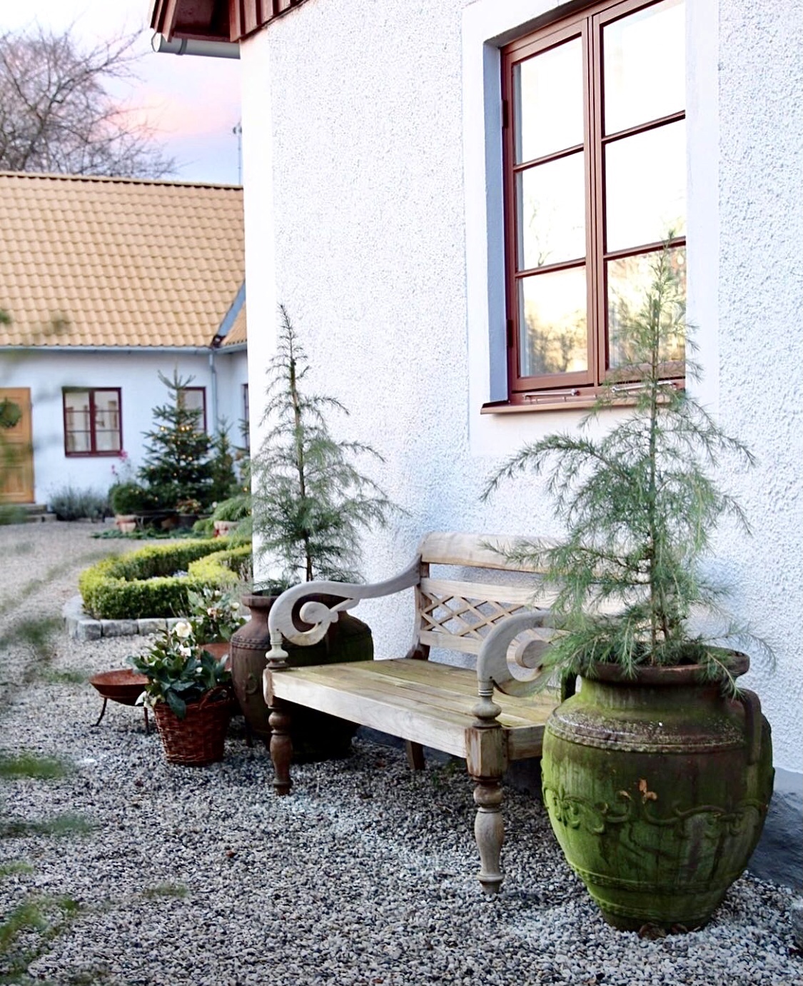 A beautifully aged wooden bench against a white facade, surrounded by mossy pots with planted cedars & gravel walk – very beautiful outdoor setting in all its simplicity.