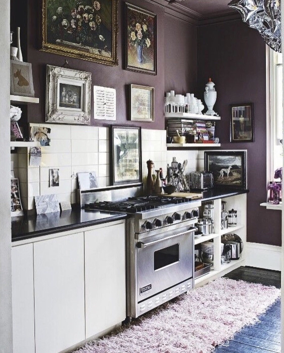 A lovely kitchen with the rich wall colour, wooden floor, and lots of great details with the vintage frames – an amazing personal touch.