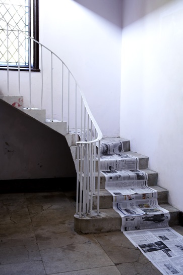 Styling, with everything wrapped & the wall covered with newspaper / Designismine