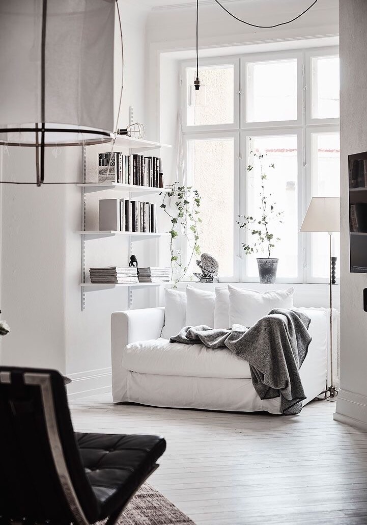 I’ve posted a lot of white & neutral images lately & here’s one more. It’s beautiful with the natural light & the window without curtains for once. It provides the generous arm chair a perfect place for reading. Simple shelves in white to the white wall & the floor – very nice & appealing!
