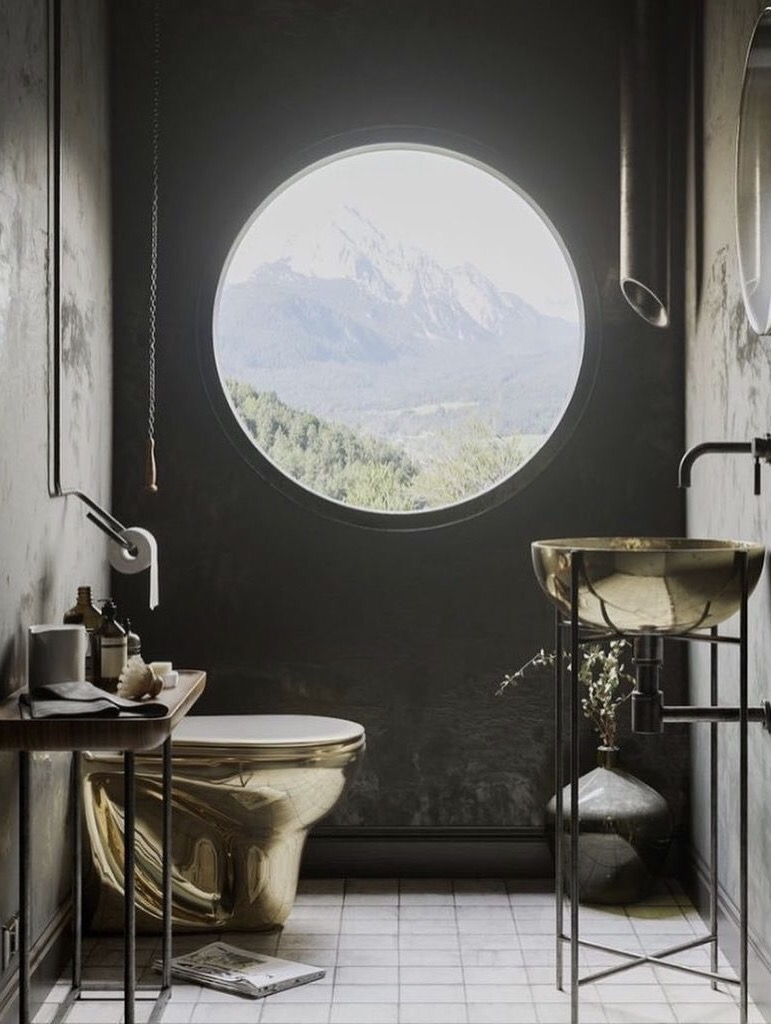 Bathroom decorated in shiny metallic furnishings with thin frames, to take up as little space as possible. And a wonderful windows, large & round with a fantastic view. Small but very inspiring, let’s just agree.