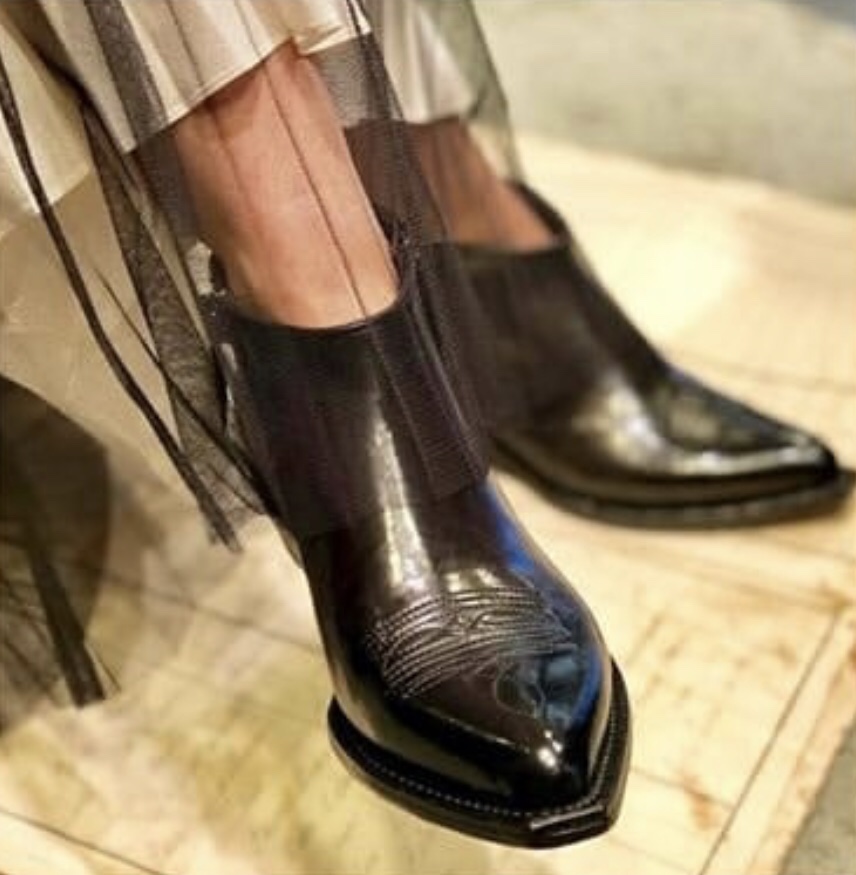 Nice when you mix styles based on your own personal taste. Long pleated skirt combined with slightly longer part of chiffon to the low leather boots.