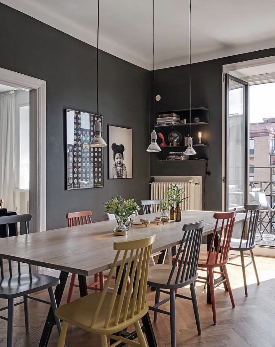 A dark wall in an otherwise bright room provides a dramatic effect. It’s inspiring with frames & small storage- and – with a variety of chairs in different colors – very nice!