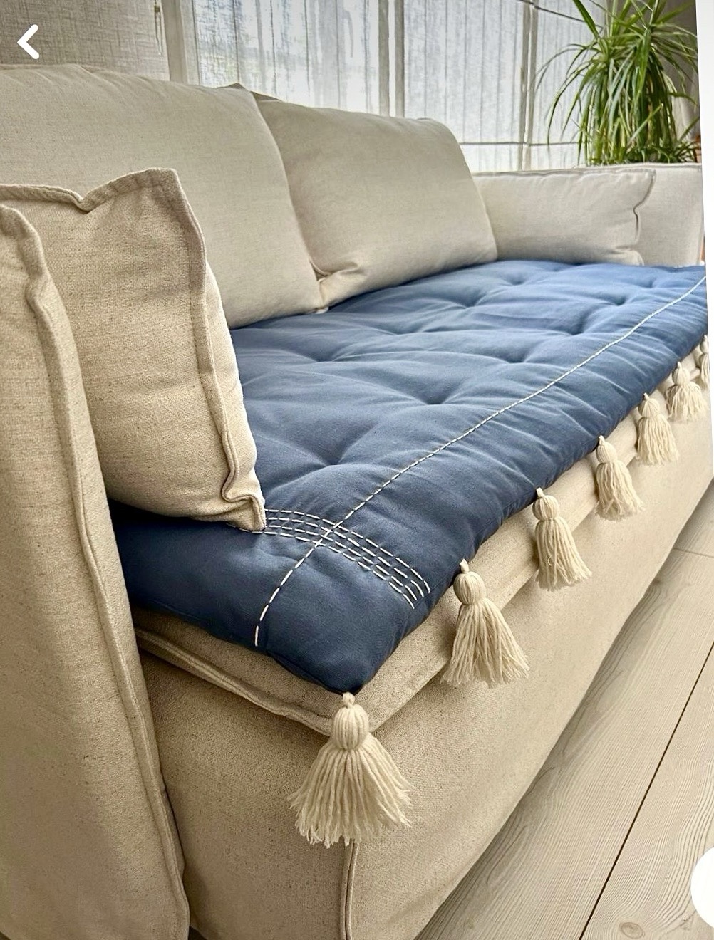 Off-white sofa with a long seating area without the traditional two & three seater, with a blue sleeping pad of the same length, with white tassels.