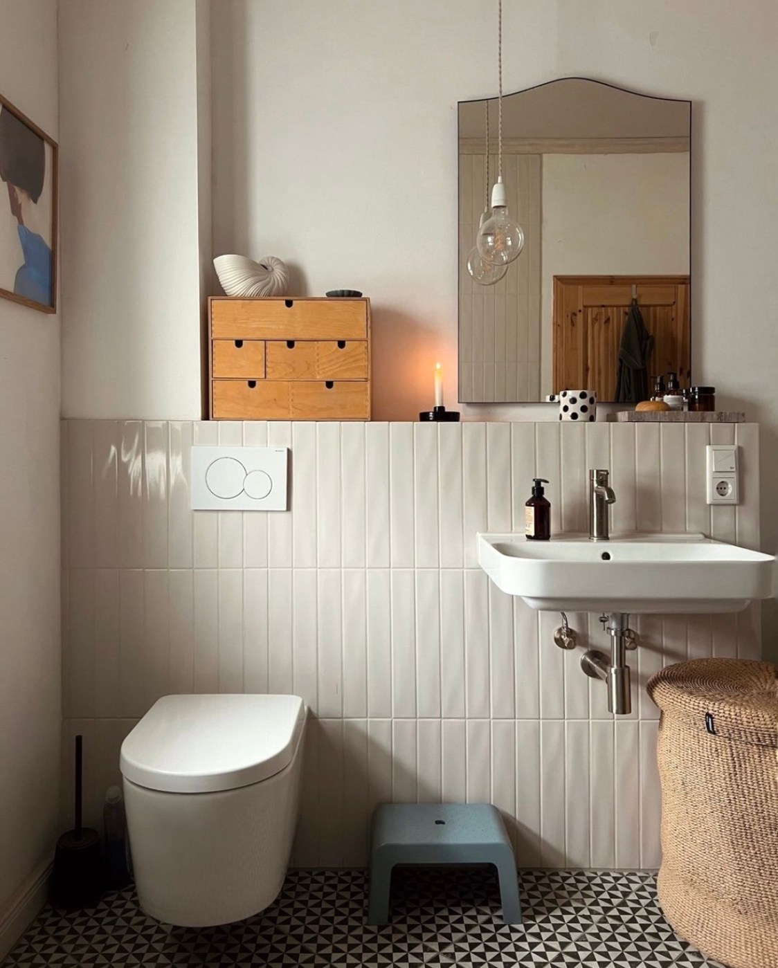 I like the solution with an extended low wall where you create space that can be used for small storage & decorative details. It creates a depth in the room.