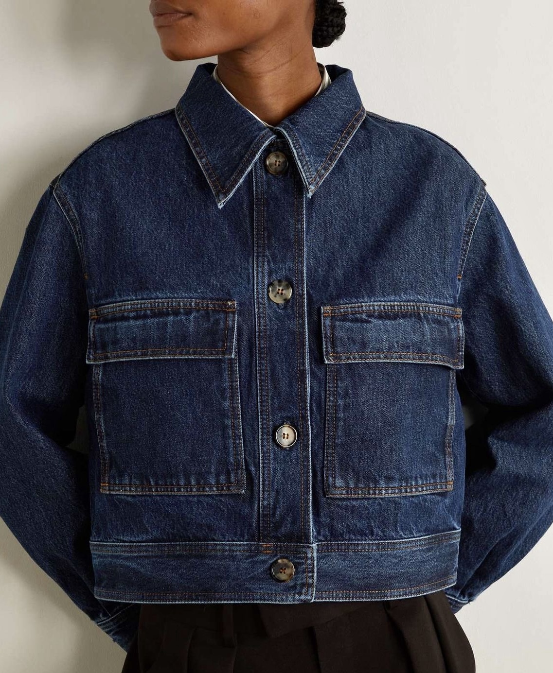 Nordstrom’s cropped organic denim jacket. The Stockholm label’s Scandi-cool aesthetic is mixed with a workwear vibe. It makes this cropped denim jacket, with oversized pockets, stand out & become a wardrobe staple.